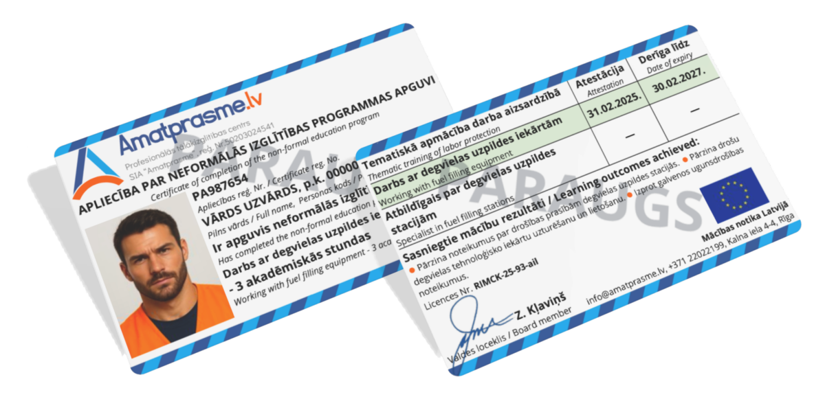 - Iegūsi nepieciešamās zināšanas drošai darbībai degvielas uzpildes stacijā.