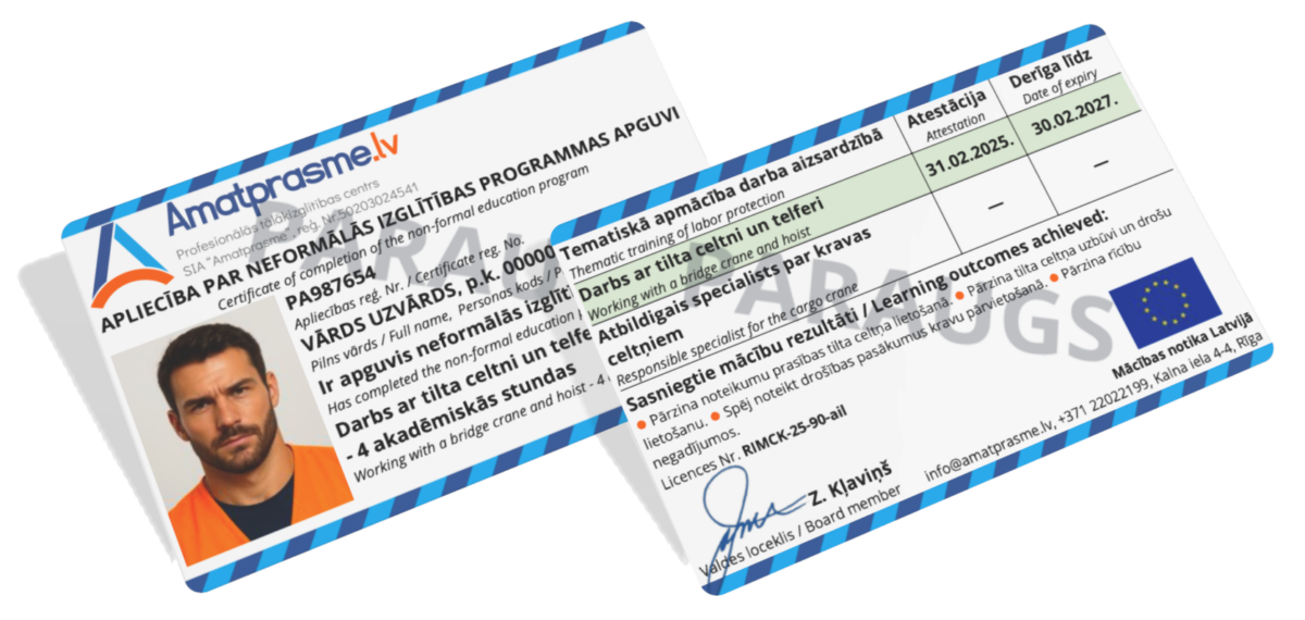 Apliecību izdodam latviešu, angļu un krievu valodā, kas sniedz iespēju apliecināt iegūtās zināšanas un prasmes ārvalstīs.